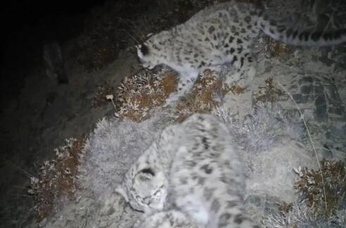2月28日,阿克塞县自然资源局林业生态工作站工作人员在阿克塞县境内海拔3000多米的祁连山区,开展野生动物疫源疫病巡查过程中,对2019年年底与世界自然基金会(WWF)合作架设的部分红外线相机进行了回收,在回收的一台红外相机中发现四只雪豹同框的珍贵画面,这是在这一地区首次拍摄到四只雪豹同框画面。视频共四段,可以清晰地看出,是一只母雪豹带着三只幼崽在夜间活动。