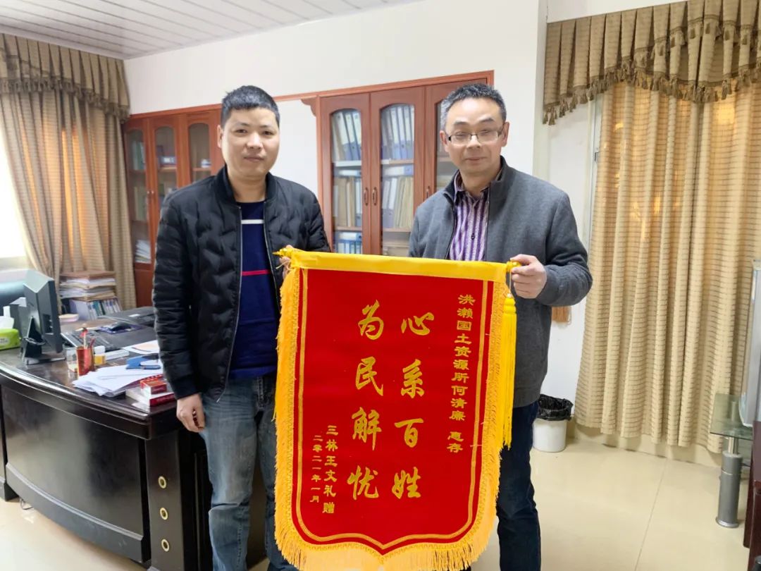 3月10日,南安市洪濑镇三林村王氏兄弟专程到洪濑国土资源所送上“心系百姓 为民解忧”锦旗,以表达对该所所长何清廉的感激之情。