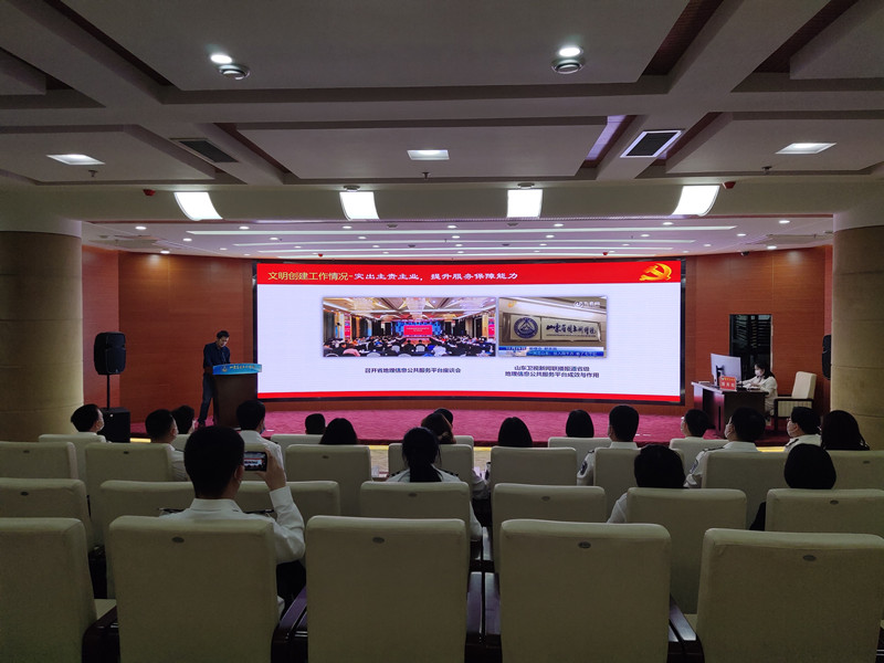 随后,观摩团一行共同观看了山东省地理信息公共服务平台、北斗一张网、院规范化管理演示片,听取了院精神文明建设情况介绍,现场查看了省国土测绘院精神文明建设资料。