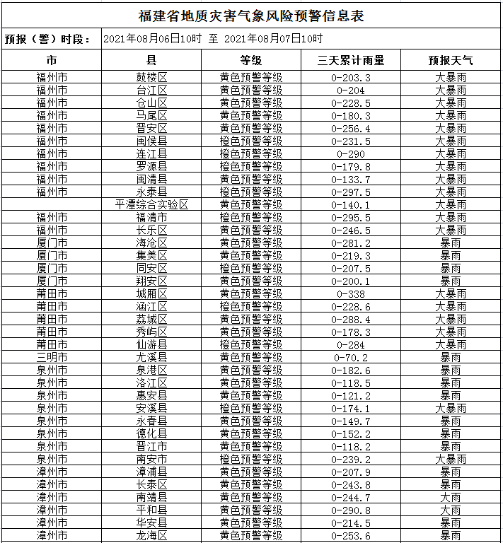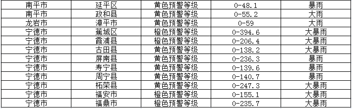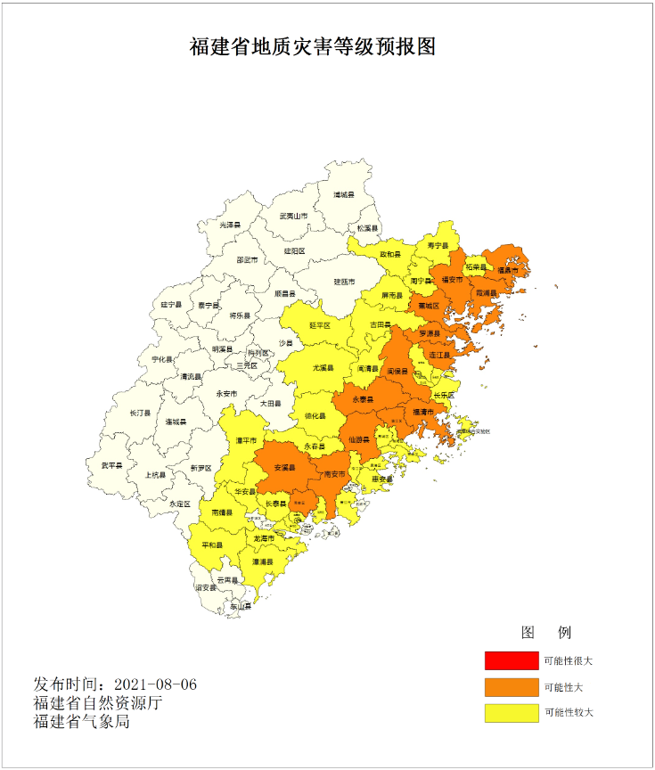 福州市的闽侯县、连江县、罗源县、永泰县、福清市,厦门市的同安区,莆田市的涵江区、仙游县,泉州市的安溪县、南安市,宁德市的蕉城区、霞浦县、福安市、福鼎市,地质灾害气象风险预警为橙色预警,地质灾害发生可能性大,应做好值班值守、监测、巡查和防范,应按有关规定及时组织危险性较大的地灾隐患点和危险区域内的群众转移,确保人民生命安全。