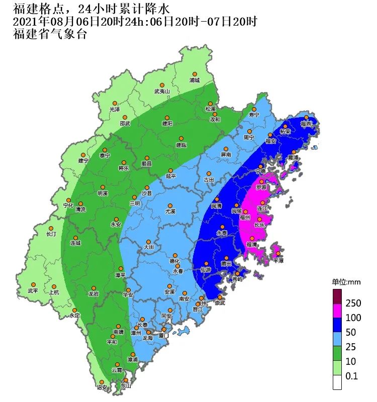 今天,沿海地区依然有暴雨,其中中北部沿海地区有大暴雨,局部特大暴雨,其余地区局部有暴雨,24小时雨量80毫米~200毫米,局部可达280毫米,最大小时雨量70毫米。