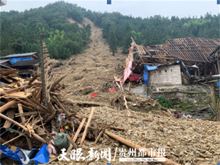 6月20日凌晨,因受暴雨天气影响,三都自治县三合街道拉揽村高寨发生了山体滑坡。由于监测预警及时,灾害发生地群众全部紧急撤离,无人员伤亡。图为灾难现场