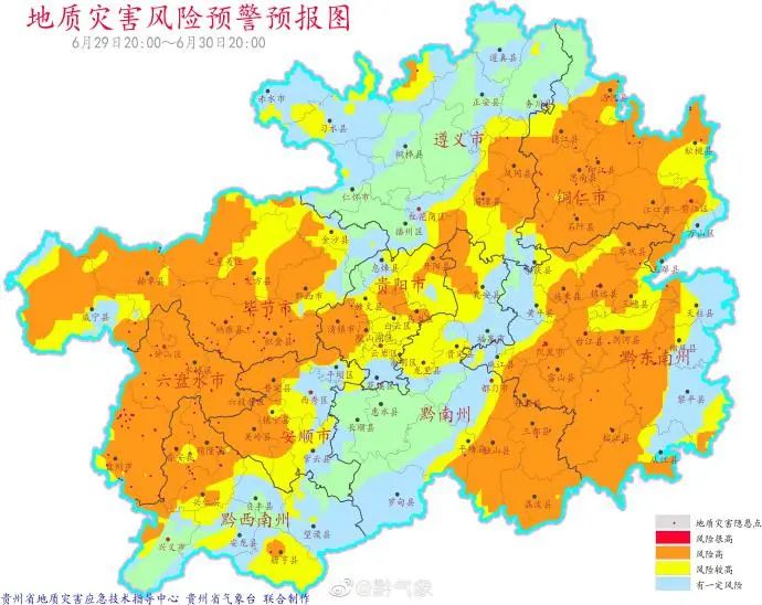 图为贵州省气象台发布的06月29日20时-6月30日20时贵州省地质灾害气象风险预报图