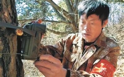 一身迷彩服常年不离身,一双军用鞋365天不下脚,他以大山为友、与动物为伴,绿海松涛,鸟鸣花香,见证着他的执着与付出,勇敢和坚守。