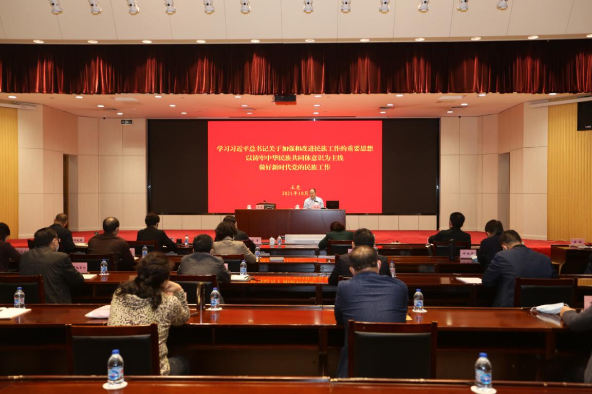 培训会上,市政协委员、市委党校特聘教授王竞同志作了题为《学习习近平总书记关于加强和改进民族工作的重要思想,铸牢中华民族共同体意识主线,做好新时代党的民族工作》的专题辅导,主要从会议背景特点、党的民族工作百年成就、民族工作面临形势、工作根本遵循、五项重点任务、贯彻落实思考等六个方面进行了全面细致的解读。