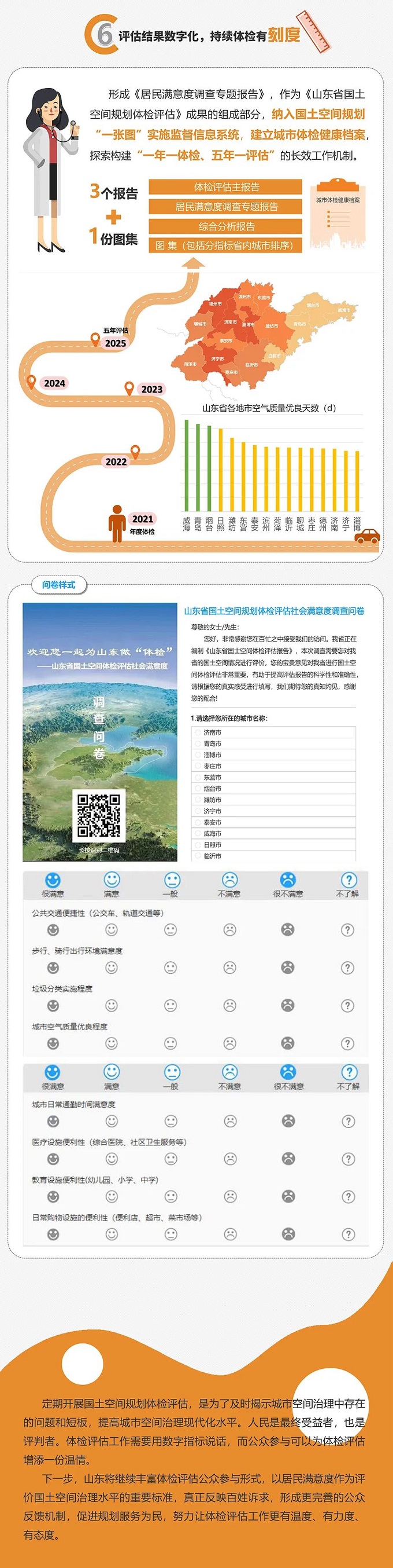 2021年8月,自然资源部办公厅印发《关于认真抓好<国土空间规划城市体检评估规程>贯彻落实工作的通知》(自然资办发〔2021〕55号),部署各省(区、市)全面开展国土空间规划城市体检评估工作。山东省自然资源厅高度重视、认真贯彻落实文件要求,在完成规定动作基础上,勇于创新、善于创新,在全国率先探索开展了省级尺度的国土空间规划体检评估工作,形成主报告、居民满意度调查专题报告、分指标省内城市排序、图集等一系列成果,围绕安全、创新、协调、绿色、开放、共享6个维度评价国土空间治理方面的成效与不足,提出5方面改进对策和5个行动计划。