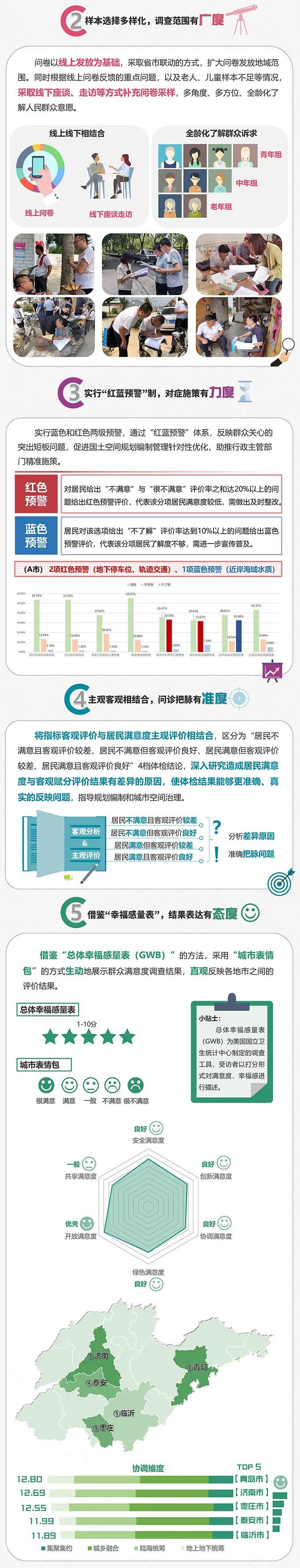 特别是探索出一套鲜明体现“以人民为中心”发展思想的居民满意度专题调查工作机制方法:一是问卷设计紧贴民生,问题精简、通俗易懂,提升了群众参与度;二是主观评价与客观评价相结合,分4档综合反映评价结果,不唯数据论;三是力求友好的可视化效果,借鉴“总体幸福感量表(GWB)”方法,用城市表情包生动直观表达评价结果;四是实行蓝色和红色两级预警,反映群众关心的突出短板问题,促进国土空间规划编制管理针对性优化;五是依托国土空间规划“一张图”实施监督信息系统,汇集海量数据,建立分城市的体检评估档案,为长周期监测评价各城市国土空间治理水平提供数字化支撑。