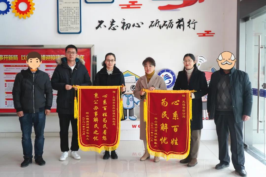 12月28日,无锡市惠山区阳山商贸城商铺业主代表向无锡市自然资源和规划局赠送锦旗,感谢省厅、市局圆了他们77户业主历时17年的产权证梦。