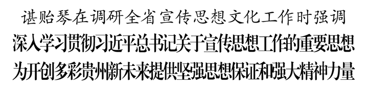 谌贻琴主持召开座谈会听取全省宣传思想文化工作情况汇报,对近年来取得的成绩给予充分肯定。她强调,全省宣传思想文化战线要深入学习贯彻党的十九届六中全会精神,强化习近平新时代中国特色社会主义思想的研究阐释和宣传普及,不断巩固拓展党史学习教育成果,坚定干部群众团结奋斗的主心骨,旗帜鲜明以“两个确立”“两个维护”凝心铸魂,让忠诚核心成为贵州党员干部最鲜明的政治品格,成为贵州政治生态最鲜明的政治底色。要奏响高质量发展主旋律,充分展现贵州经济社会发展的良好态势、改革开放创新的良好形象、招商引资和招才引智的良好氛围,广泛凝聚奋进新征程的磅礴力量。要着力加强社会主义精神文明建设,强化社会主义核心价值观引领,扎实推进移风易俗,教育引导群众改变陈规陋习,努力形成适应新时代要求的思想观念、精神面貌、文明风尚、行为规范。要聚焦建设多彩贵州民族特色文化强省主目标,做足贵州特色,做精文化服务,做强文化产业,做好文旅融合,坚定贵州人的文化自信,努力实现文化事业文化产业高质量发展。要掌握意识形态工作主导权,坚持敢于斗争、善于斗争,管好管住各类平台阵地,着力防范化解风险挑战,坚决维护我省意识形态安全。要建强工作主力军,全面加强党的领导和党的建设,着力增强政治敏锐性,增强工作责任心,增强班子凝聚力,锤炼忠诚干净担当的宣传思想文化队伍。