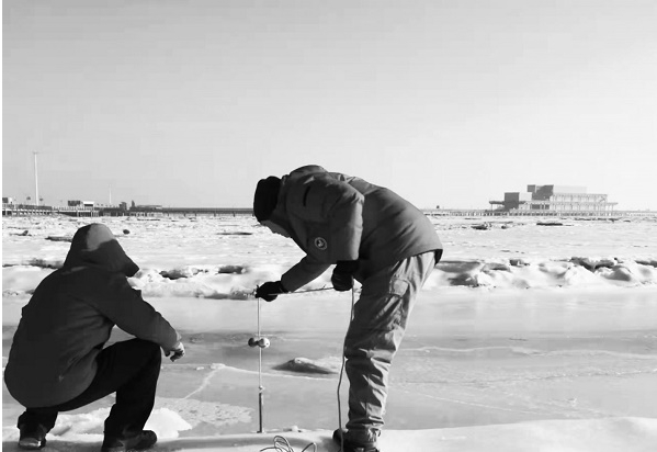 钻出海水后,一名队员拿出温盐仪插入冰孔中,测取其冰温、盐度等数据。随后又拿出钢尺对海冰厚度进行测量并记录在册。整合分析现场数据后,将有效数据实时传送到北海预报中心。