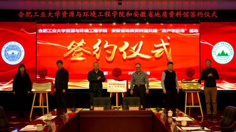 1月28日下午,合肥工业大学资源与环境工程学院与安徽省地质资料馆“政产学研用”基地签约仪式,在省地质资料馆举行。由省自然资源厅矿产资源保护监督处主持签约仪式,双方负责人签约并与参会嘉宾共同为实践教学基地、劳动教育基地、协同创新中心揭牌。