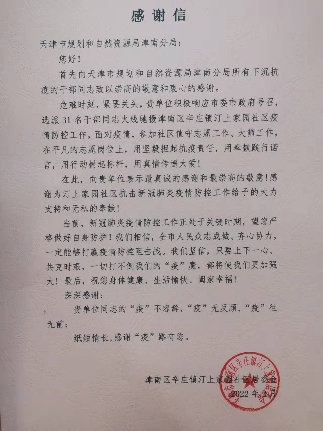 图:辛庄镇汀上家园社区致津南分局的感谢信