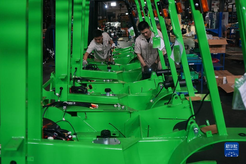 在位于江苏靖江的江苏中力叉车有限公司,工人在生产“油改电”叉车(2021年6月12日摄)。新华社记者 季春鹏 摄