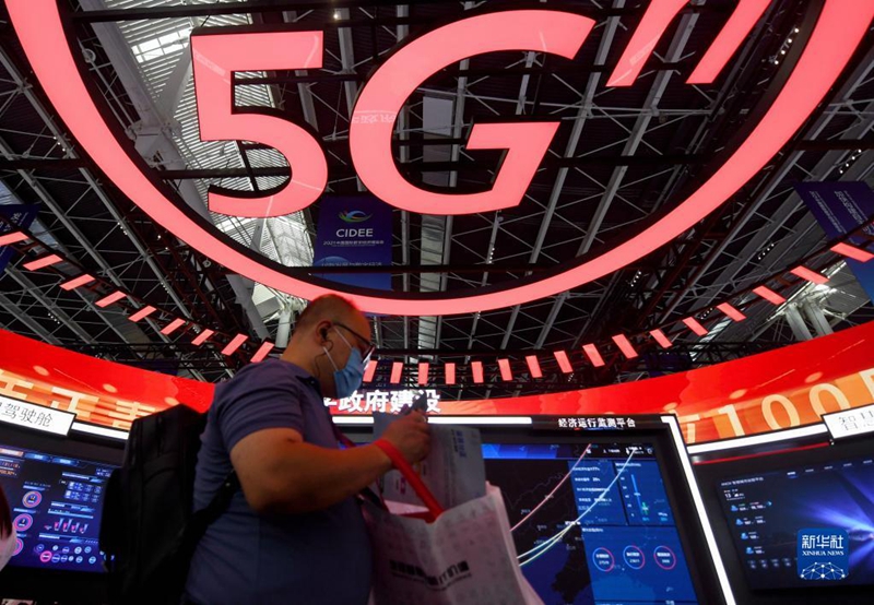 在河北省石家庄市举行的2021中国国际数字经济博览会上,参观者走过5G智慧展区(2021年9月6日摄)。新华社记者 王晓 摄