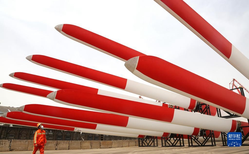 风力发电机叶片在江苏连云港港码头等待装船外运(2021年4月16日摄)。新华社发(王春 摄)