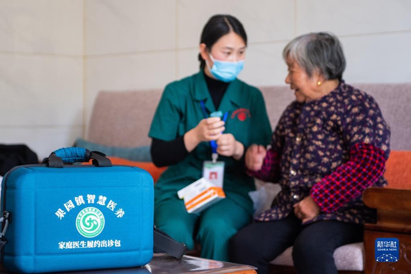 在湖南省长沙市长沙县果园镇杨泗庙社区,医务人员指导居家老人用药(2021年11月12日摄)。新华社记者 陈思汗 摄