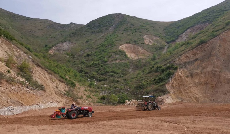 近日,在富平县宫里镇雷村、薛镇前坡村工矿废弃地整治现场,正在开展春耕春播工作,前面旋耕机翻地作业,后面播种机种下一行行早熟玉米种子,近100亩废弃矿坑成为了可耕良田。