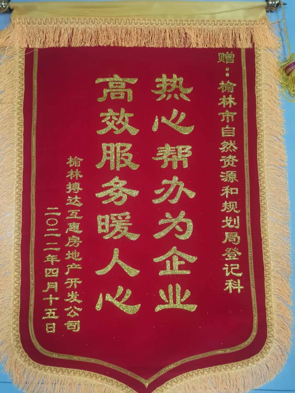 近日,某房地产开发企业负责人专程来到榆林市局,送来一面“热心帮办为企业 高效服务暖人心”的锦旗,特别感谢市局“交地即交证”服务为企业群众带来的便利。