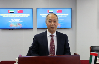 12月16日,阿联酋政府向中方捐赠首批椰枣树苗交接活动在海南省文昌市举行,农业农村部副部长马有祥通过视频连线致辞。