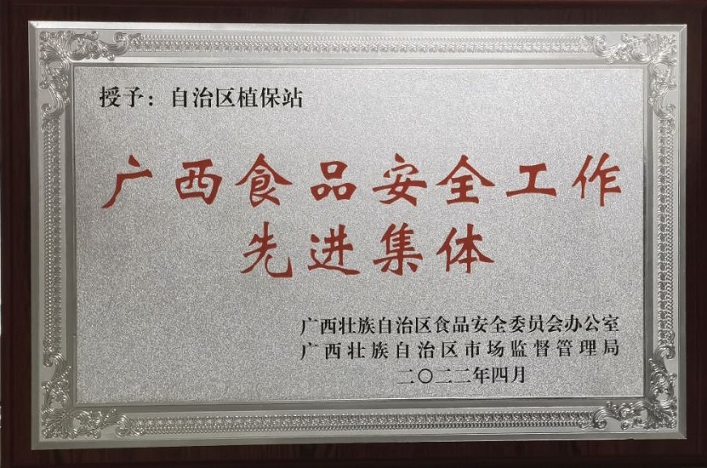 广西壮族自治区植保站一直坚决贯彻落实中央和自治区系列决策部署,主动担当作为,加强病虫监测预警,狠抓重大病虫疫情防控,大力推行绿色生产方式,持续推进农药减量增效行动,推动公共植保防灾减灾、绿色植保提质增效,强化农药质量和农产品中农残检测,致力于从源头管控,保障农产品质量安全,促进农业绿色和高质量发展,荣获“广西食品安全工作先进集体”,并作为先进集体代表上台领奖。