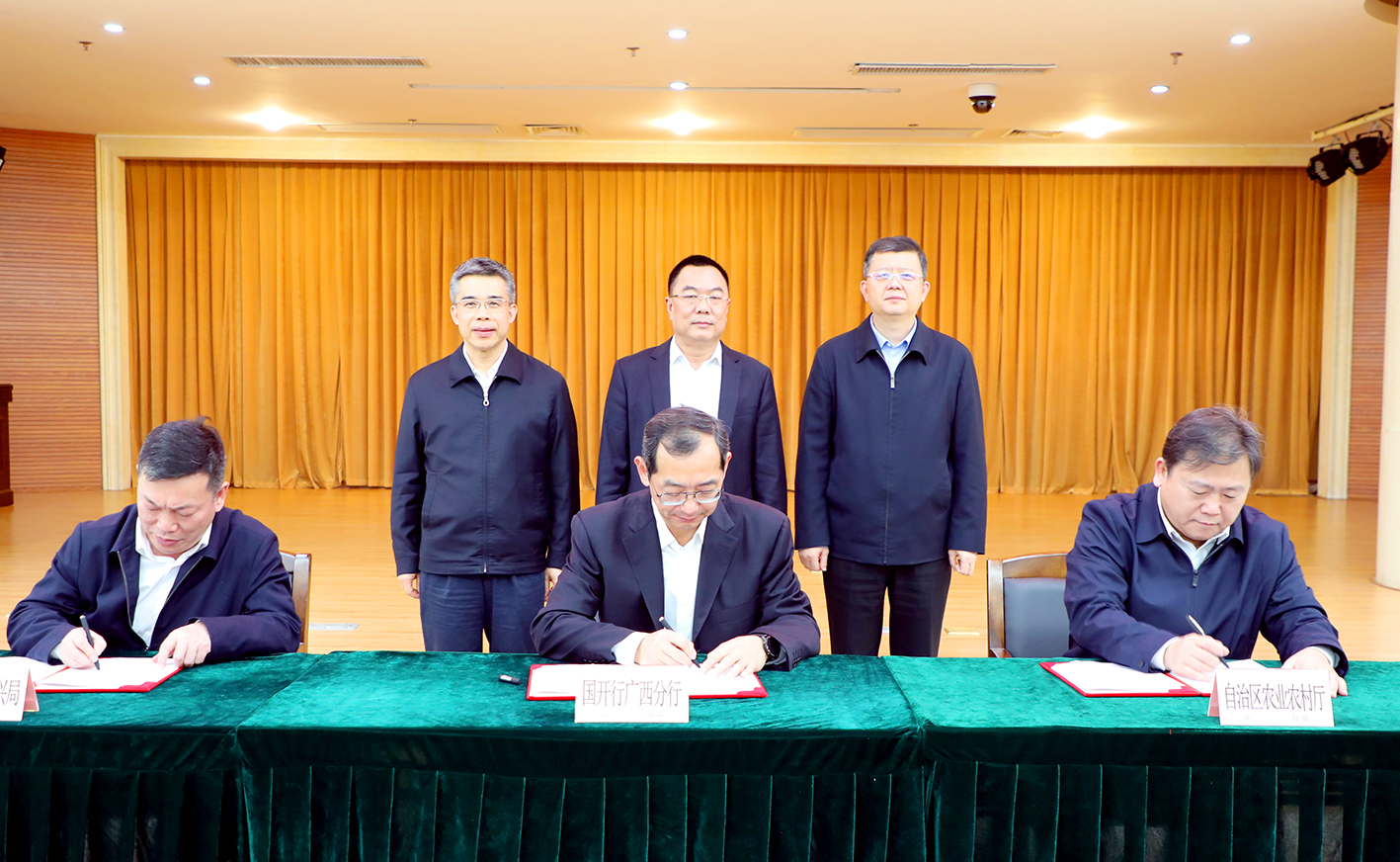 3月30日,自治区农业农村厅、乡村振兴局与国家开发银行广西分行、人保财险广西分公司、太保产险广西分公司签署战略合作协议,自治区党委农办主任、农业农村厅党组书记、乡村振兴局党组书记李宏庆在会上讲话,农业农村厅厅长、乡村振兴局局长黄智宇主持会议。国开行广西分行党委书记、行长王琳,人保财险广西分公司党组书记、总经理庞辉,太保产险广西分公司党委书记、总经理熊力分别在签约仪式上讲话。农业农村厅一级巡视员王凯学,乡村振兴局副局长杨瑞华参加签约仪式。