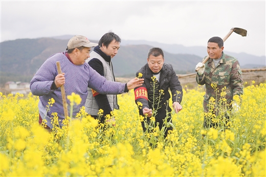 ①2月17日,在灵川县三街镇龙坪村,党员农技员正在指导村民管护油菜花。黄勇丹 彭芊程/摄