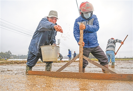 ⑥连日来,在钦州市钦南区康熙岭镇,村民在田里加紧播种育秧。广西日报记者 周 军 通讯员 张相兵/摄