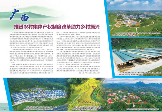 广西把农村集体产权制度改革纳入乡村振兴战略,出台《关于稳步推进农村集体产权制度改革的实施意见》,印发《全面开展农村集体资产清产核资方案工作方案》《广西农村集体产权制度改革实操手册》《关于规范村级集体经济收益分配的指导意见》等一系列配套文件;每年由自治区农业农村体制改革专项小组办公室制定年度改革工作方案明确任务,突出抓好业务培训与宣传引导,围绕关键环节试点示范推进。到2021年10月底,广西完成4批全国试点和整省(区)试点工作,基本完成农村集体产权制度改革阶段性任务。