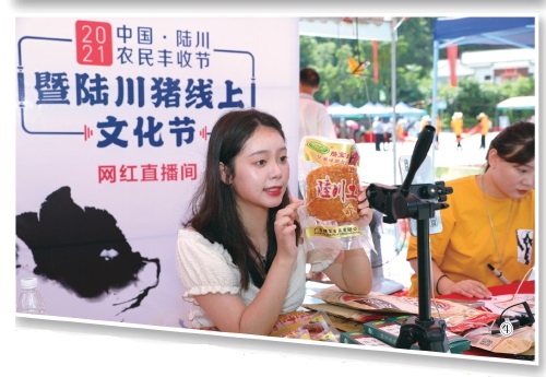 图④:玉林市陆川县中国农民丰收节期间网红直播带货助力农产品销售。蓝晓阳摄