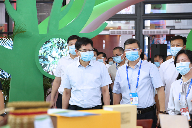蓝天立一行先后巡视了供粤港澳大湾区及出口品牌农产品展区、对外合作平台建设成果展区、对外科技合作成果展区、对外合作平台建设及数字农业发展成果展区等多个展位;认真听取了广西农业水果、茶叶、大米、智慧农业、大数据系统等近20个产业的发展及对外合作成果介绍。