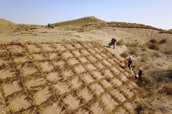 甘肃古浪县八步沙林场治沙人和群众进行“草方格压沙”作业。(2020年3月6日摄,无人机照片)。新华社记者 范培珅 摄
