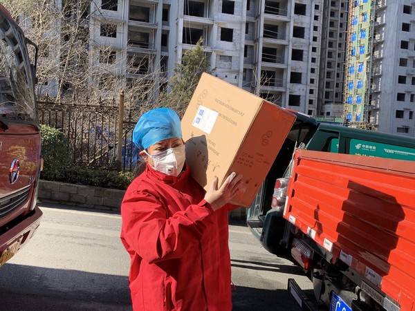 郑州圆方集团党委书记薛荣疫情期间在湖北省十堰市抗疫救灾指挥部后勤仓库搬运物资(资料照片)。新华社发