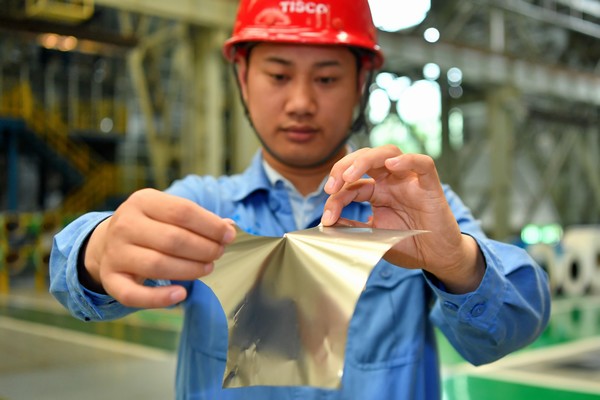 在位于山西的太钢集团,员工在展示用手撕开0.02毫米厚的超薄带状不锈钢(2019年5月24日摄)。新华社记者 曹阳 摄