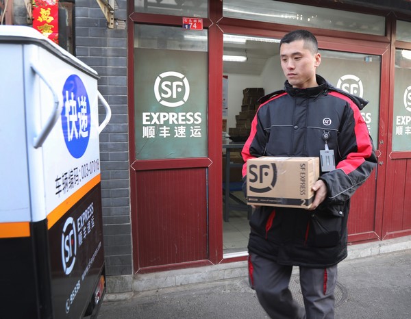 北京前门石头胡同快递站点“快递小哥”刘阔在整理包裹(2019年2月1日摄)。新华社记者 李德欣 摄