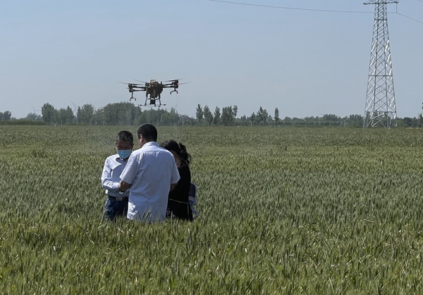山东德州夏津县新盛店镇东马庄村,几台植保无人机从低空掠过开始泛黄的麦田,掀起层层麦浪。这是当地社会化服务组织根据统一部署,开展第二遍小麦防虫、防病、防干热风的“一喷三防”飞防作业。上午,气温已经攀升到31摄氏度,县里的农技专家正在针对灌浆期小麦生长问题提供指导。