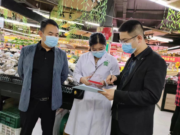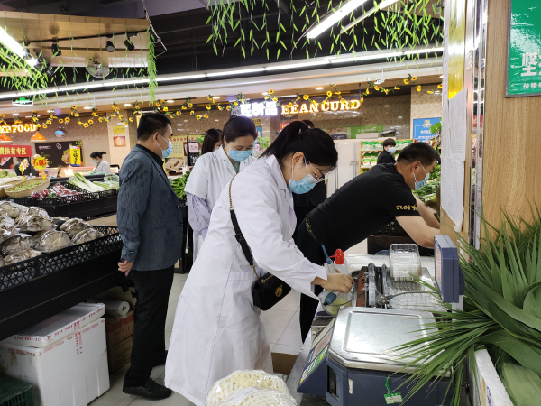 工作人员先后来到客都超市、北关农贸市场、河东市场、全家福超市等蔬菜水果销售场所,进行随机抽样、现场检测、现场出报告。
