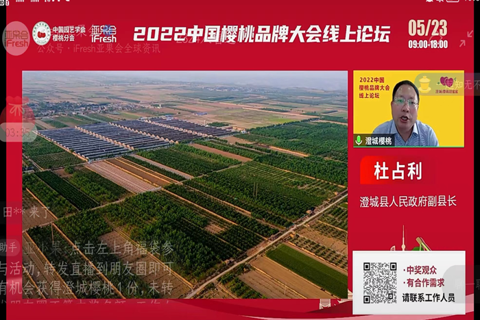 花果飘香季,樱桃满枝头。继5月15日澄城县作为主会场承办了2022年中国樱桃年会、5月18日成功举办了第三届中国·澄城樱桃云营销季暨陕西水果网络特色季•樱桃季开幕式后,5月23日,由iFresh亚果会主办的2022中国樱桃品牌大会线上论坛开幕,同期举办第三届中国樱桃展云展,澄城樱桃作为联合主办单位通过线上参加论坛。县委副书记蔡学宏致辞,县政府副县长杜占利推介澄城樱桃。