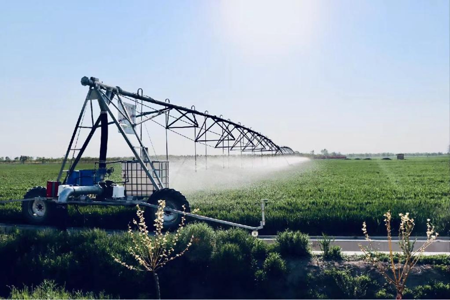 农场智慧云平台接到这条“急电”,经过十几秒的自动研判后,向田间自走式水肥一体喷灌机发出指令,喷灌机开启精准浇水作业。