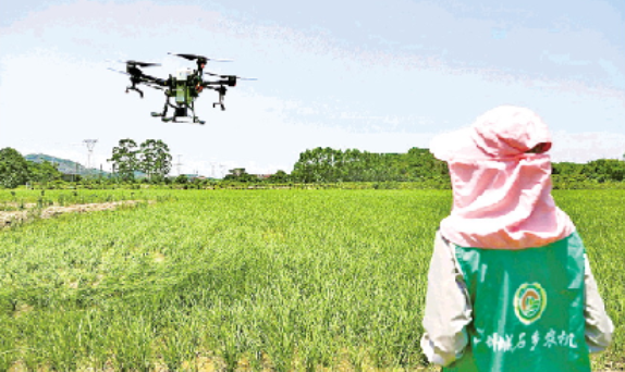 农机手正在操作农用无人机,为水稻喷洒农药和撒施肥料。