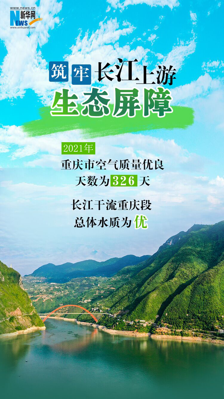 人不负青山,青山定不负人。数据显示,如今的重庆,水更清了——2021年,长江干流重庆段水质保持为Ⅱ类,74个国控断面水质优良比例达98.6%;山更绿了——全市森林覆盖率提高到54.5%;天更蓝了——全市空气质量优良天数达326天;土更净了——全市建设用地安全利用得到有效保障,受污染耕地安全利用率达到99.1%。