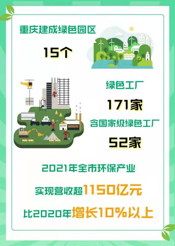 绿色低碳产业正牵引这座城市的高质量发展。数据显示,重庆已累计建成绿色园区15个、绿色工厂171家(国家级绿色工厂52家),2021年全市环保产业实现营收超1150亿元,比2020年增长10%以上。