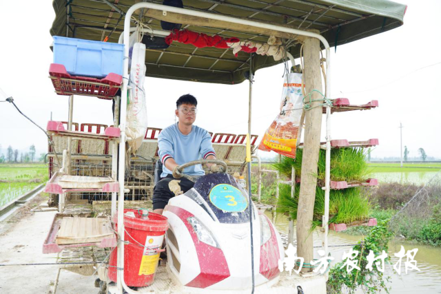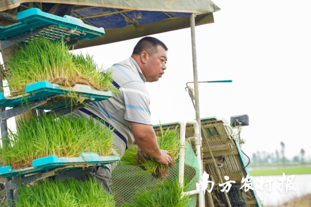 人勤春来早,地勤土生金。春耕时节,在一片绿色“海洋”中,都斛镇公认的“种粮大王”李胜业开着插秧机业挥汗如雨,后面一簇簇秧苗整齐地排列在田里。谈话间记者得知,他已经完成了下莘村近百亩的插秧任务。