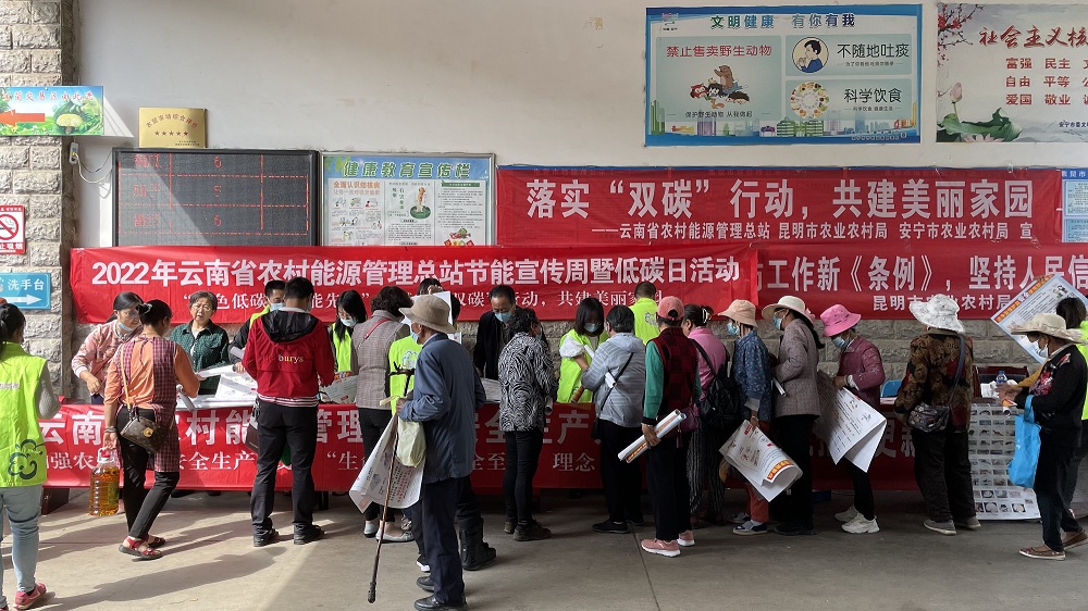 6月15日上午,省农村能源管理总站全体职工在昆明市安宁市禄脿街道办事处集市开展2022年节能宣传周、低碳日暨安全生产月宣传活动。