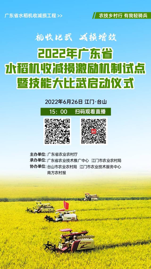 眼下正是全省水稻成熟的季节,6月26日,2022年广东省水稻机收减损激励机制试点暨大比武活动将在广东省江门市正式启动,点燃今夏丰收季!