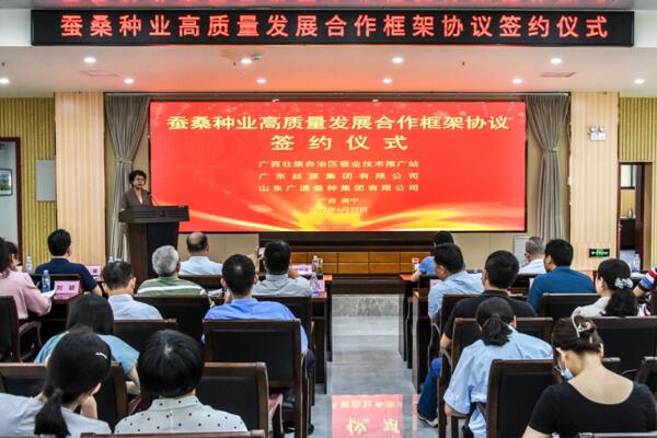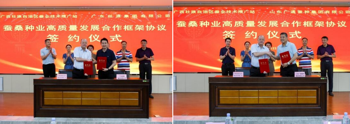 广西蚕业技术推广站与广东丝源集团有限公司、山东广通蚕种集团有限公司就加强家蚕新品种培育与应用、高标准家蚕良种繁育基地建设、蚕种生产经营等业务达成合作共识,签订了《蚕桑种业高质量发展合作框架协议》。