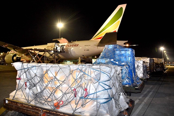 2020年4月14日,中国援助的抗疫物资抵达南非约翰内斯堡奥坦博国际机场。新华社发(中国驻南非大使馆供图)