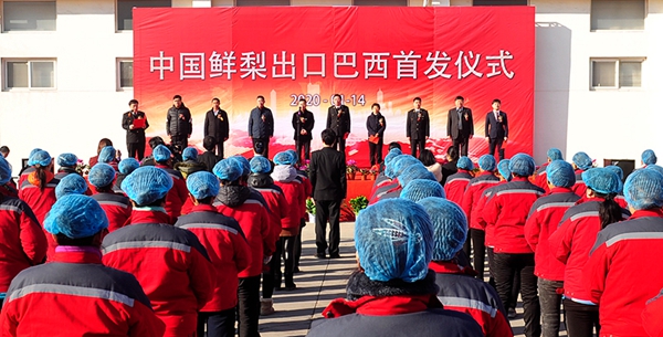 2020年1月14日,中国鲜梨出口巴西首发仪式在河北沧州泊头举行。新华社记者 牟宇 摄