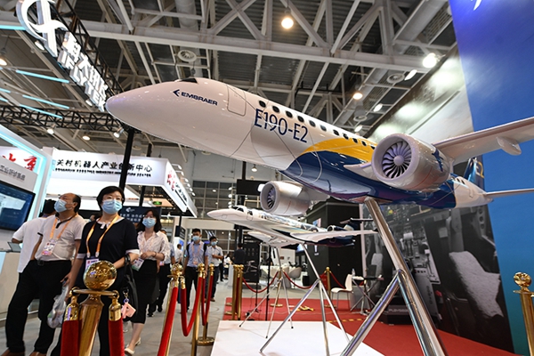 参观者从2021金砖国家新工业革命展展出的飞机模型前走过(2021年9月8日摄)。新华社记者 林善传 摄