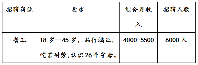 从昆明市就业工作领导小组办公室获悉,昆明闻泰通讯有限公司拟招聘普通工人6000人,招聘条件:18岁--45岁,品行端正,吃苦耐劳,认识26个字母;综合待遇:每月4000-5500元人民币。
