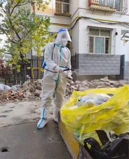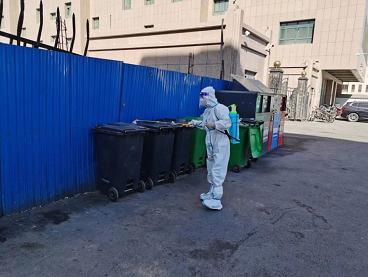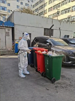 巾帼不让须眉 测绘成果中心工程师靳镜宇在米东区丰源社区对垃圾站进行全面消杀